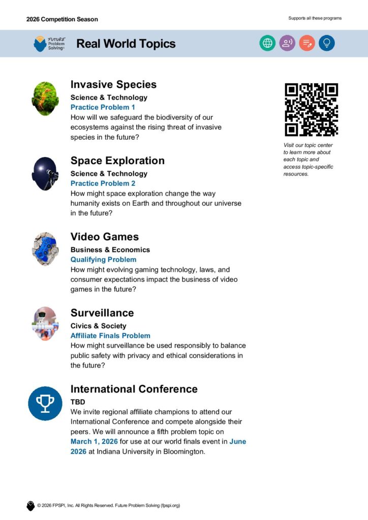 Topics Season 2025-2026 TopicsOur real world topics are future-focused Each year our topics represent important challenges from business, civics, society, science, and technology. For further information on the topics, visit https://fpspi.org/topics or click on the QR code below.